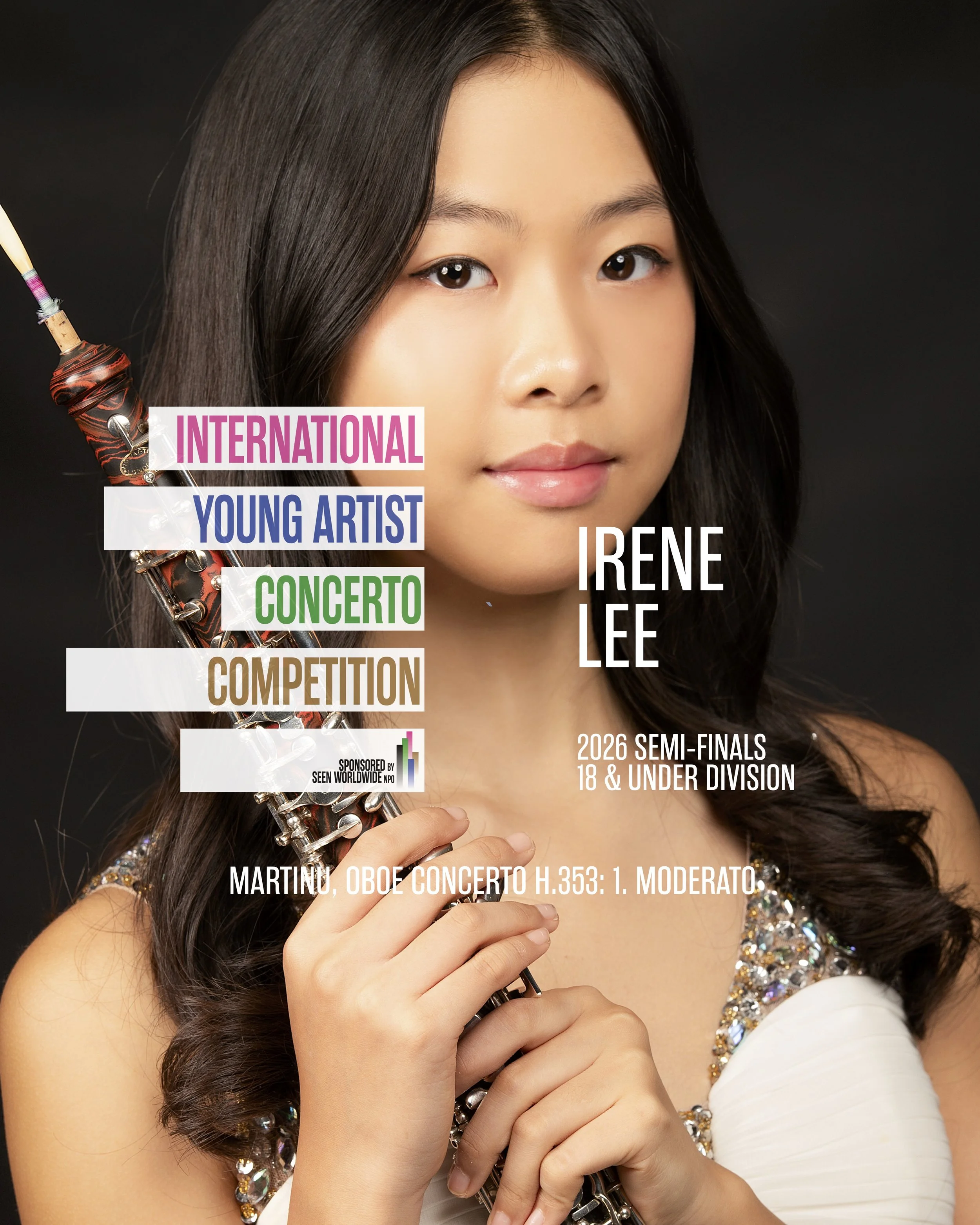 Irene Lee, a seventeen-year-old oboist, had already proven herself to be a talented musician since the start of her musical journey at the age of eleven. During her oboe career, Lee had won numerous international and national competitions including the YoungArts Competition, NJWS Youth Soloist Competition, the Adelphi Young Artist Competition, the National League of Performing Arts Competition, the Camerata Artists International Competition, LISMA, NYYVC, among others. As a soloist, she performed with the Juilliard Pre-college Symphony Orchestra, the New Jersey Winds Symphony, the Little Orchestra Society in the Kaye Playhouse at Hunter College, and the New Virtuoso Orchestra. Lee also participated in NYO2 in 2023 and 2024, and in the Verbier Festival Junior Orchestra in 2025. Lee currently studies under Elaine Douvas and Yousun Chung at Juilliard Pre-college. Beyond her musical pursuits, Irene harbors a passion for creative writing, dancing, and baking.