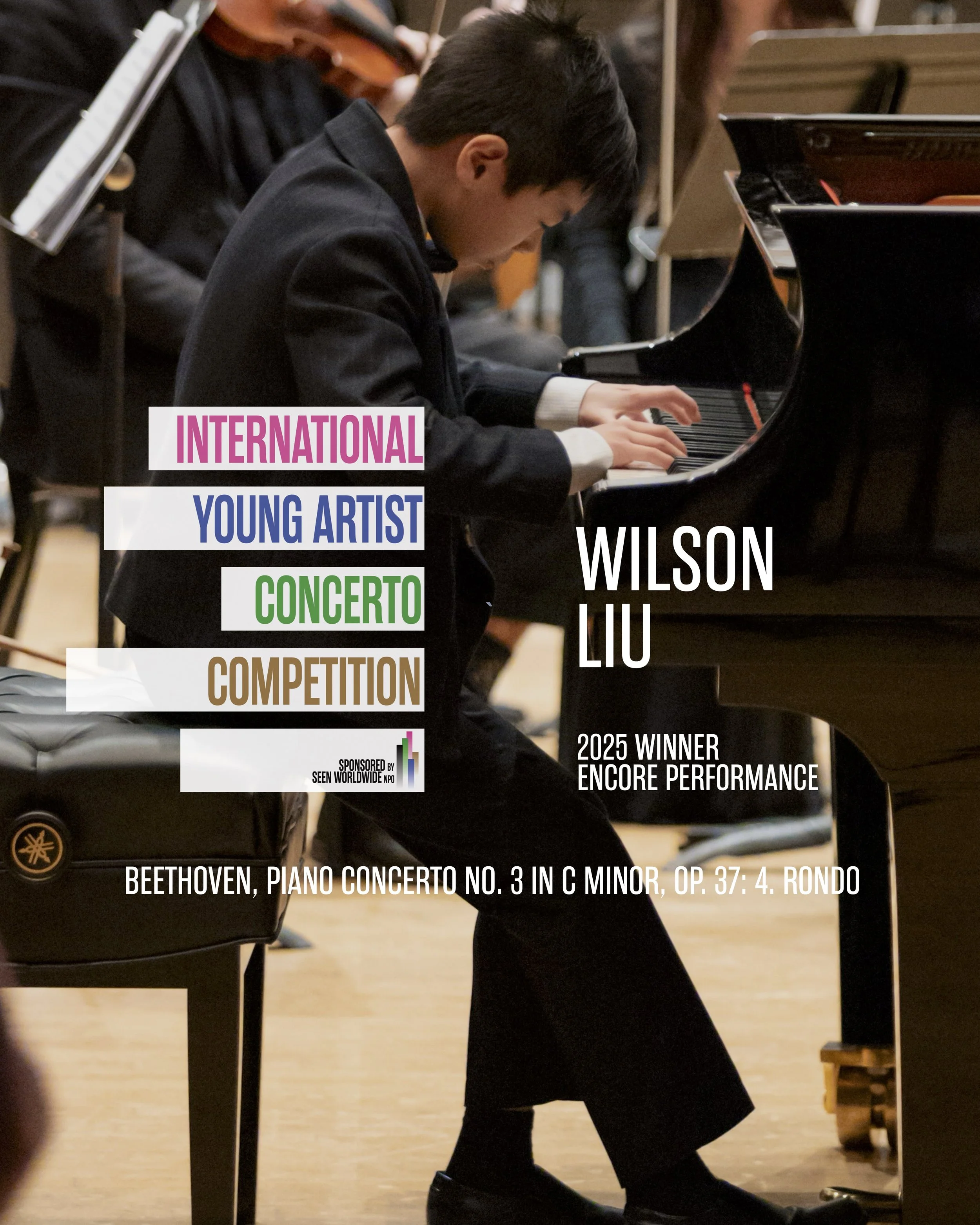 A 2025–26 From the Top Fellow, Wilson will be featured on NPR broadcasts, podcasts, and social media platforms. Since beginning his piano studies, he has earned top prizes in numerous competitions, including the Kaufman Music Center International Youth Competition, XIV Chopin Piano Competition Hartford, and the Chicago International Competition. As the youngest contestant, he won both the 2025 International Young Artists Concerto Competition in Chicago and the Young Artist Concerto Competition in Vancouver, leading to upcoming performances with Seen Worldwide, NPO, and the Vancouver Symphony Orchestra. Most recently, Wilson won the 2025 Nashville International Chopin Competition, receiving the Junior Alexei Sultanov Prize, an honor created especially for him. Wilson treasures the joy and personal growth found in preparing for performances and looks forward to continuing his musical journey while sharing his love of music with fellow pianists.